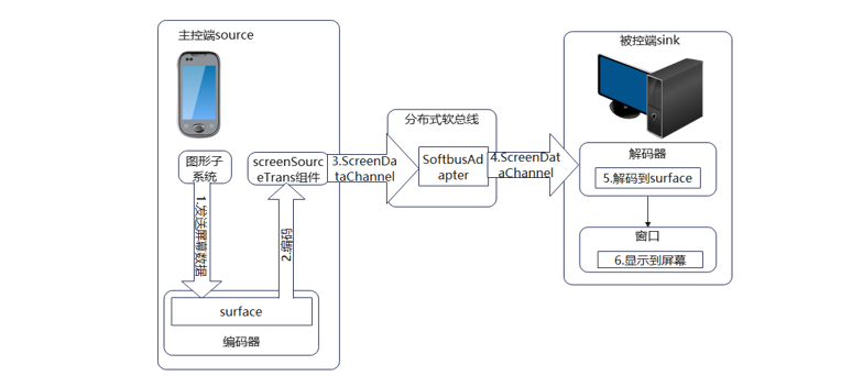 被控端(sink):被控制端,通过分布式屏幕接收主控端的控制,在本地对接窗口用于接收和显示主控端设备的屏幕内容。
