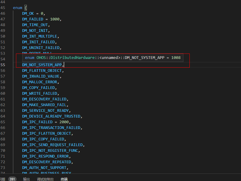 2.根据1008报错码,找到对应枚举为DM_NOT_SYSTEM_APP,报错解释为:"the caller is not a system app",表示调用方不是系统应用程序,那么根据该报错,判断需要将应用修改为系统应用方可解决问题。