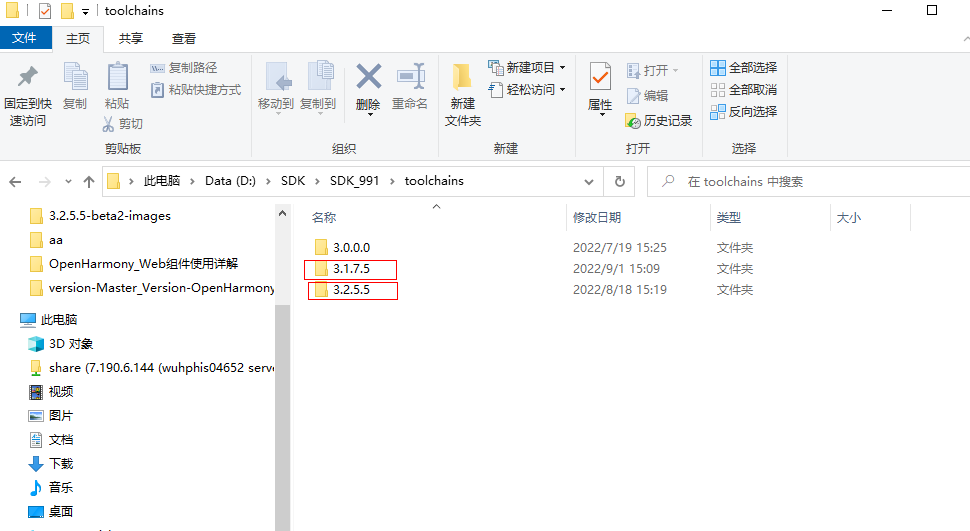 2.根据当前工程在创建时选择的SDK版本(API Version 8 或 API Version 9),确定当前工程引用的SDK版本。例如上图中,API Version 8对应的SDK版本为3.1.7.5,API Version 9对应的SDK版本为3.2.5.5。之后在本地找到对应SDK文件夹下的toolchains文件夹,并进入对应目录3.1.7.5或3.2.5.5中,然后进入lib目录中。