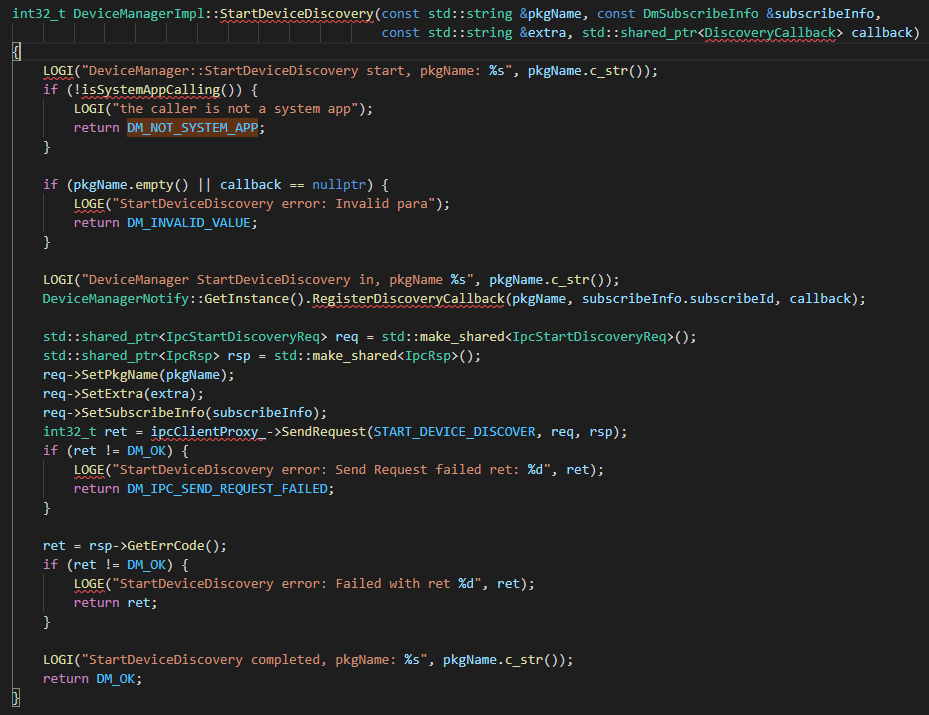 1.查看OpenHarmony 3.1 Release源码中startDeviceDiscovery接口的源码,确认返回码是从命名空间为DistributedHardware中的枚举获取的。