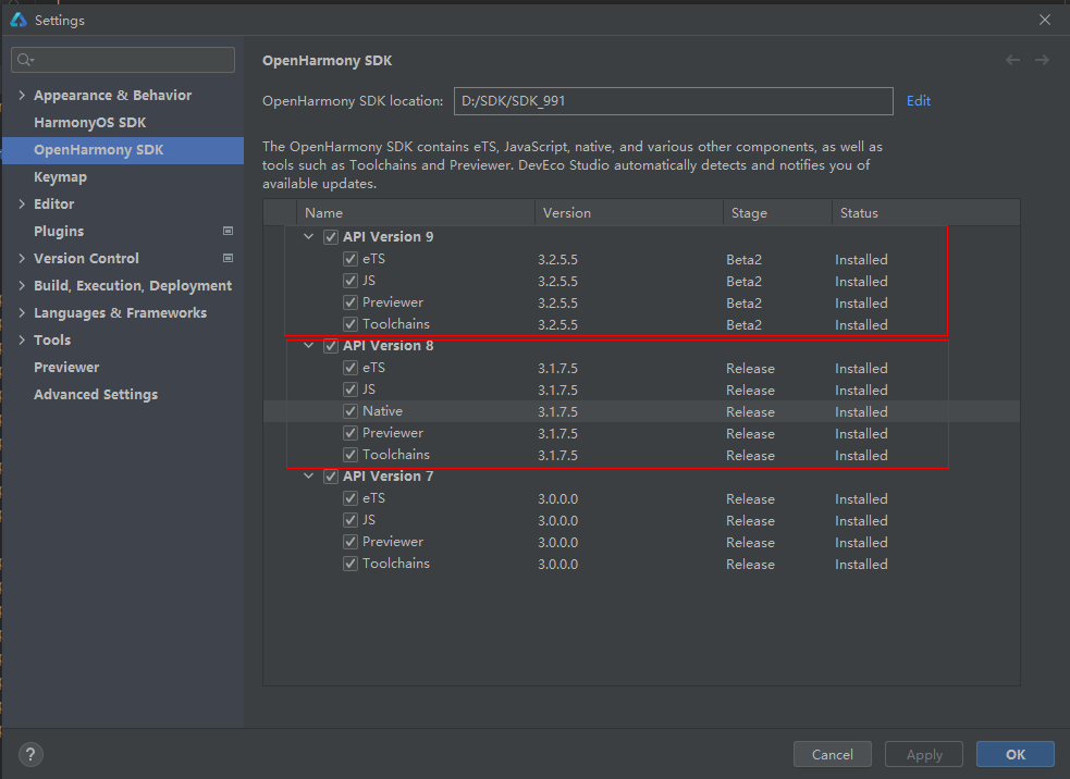 1.进入IDE-Settings设置中,查看当前引入的OpenHarmony SDK配置。