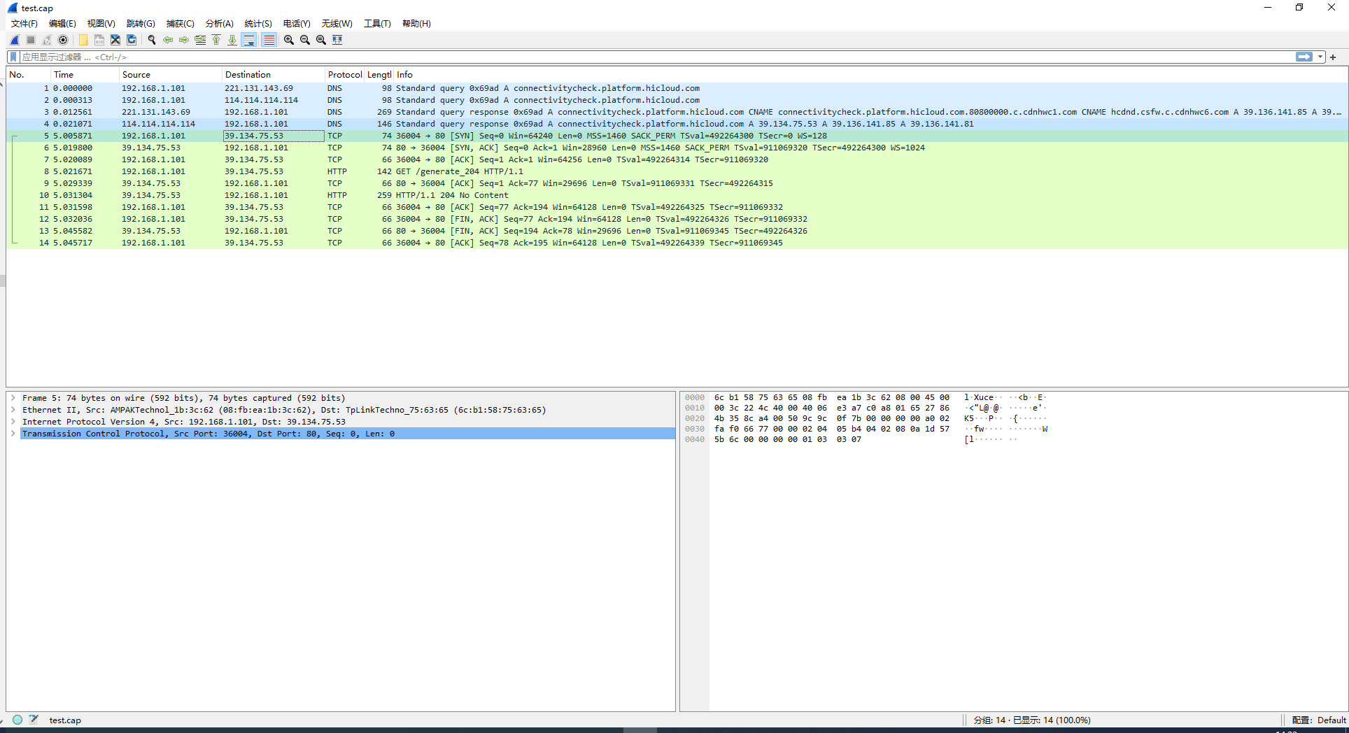 //传到板子上 hdc_std.exe shell mount -o rw,remount / hdc_std.exe file send tcpdump /system/bin hdc_std.exe shell chmod +x /system/bin/tcpdump //运行测试 hdc_std.exe shell # tcpdump -w data/local/tmp/test.cap tcpdump: listening on wlan0, link-type EN10MB (Ethernet), snapshot length 262144 bytes 14 packets captured 14 packets received by filter 0 packets dropped by kernel