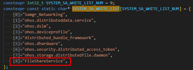 “FileShareService”是系统SA服务,不是普通的APP,是系统自带天然的可信业务,因此将“FileShareService”加到Dm的SA服务白名单中,解决5.1版本中APP级可信限制。