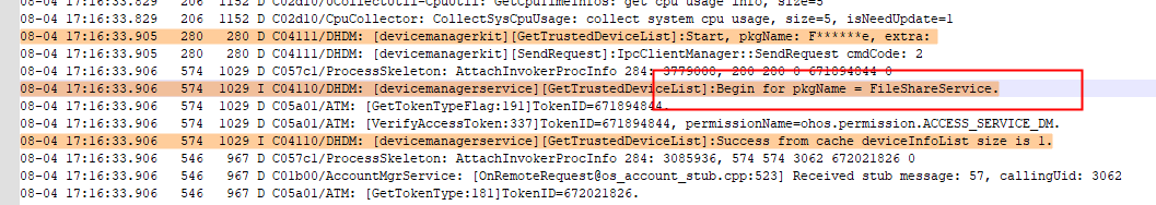 继续向上查找根因,发现可信关系是com.ohos.oneconnect.share创建的,获取又是用的FileShareService,5.1从之前5.0设备级可信改为现在的应用级可信了,所以,需要把获取时改成com.ohos.oneconnect.share,谁建立的可信关系谁就去获取。