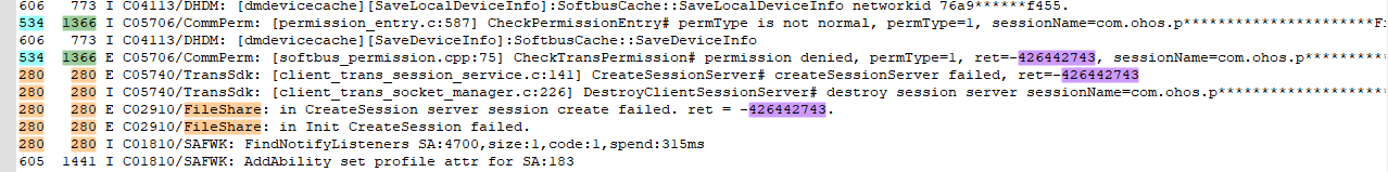 从日志中看到,创建软总线sessionserver失败,报-426442743 SOFTBUS_PERMISSION_DENIED错误;