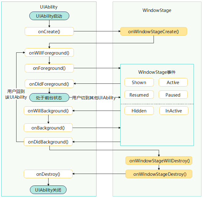 当用户在执行应用启动、应用前后台切换、应用退出等操作时,系统会触发相关应用组件的生命周期回调。其中,UIAbility组件的核心生命周期回调包括onCreate、onForeground、onBackground、onDestroy。作为一种包含UI的应用组件,UIAbility的生命周期不可避免地与WindowStage的生命周期存在关联关系。