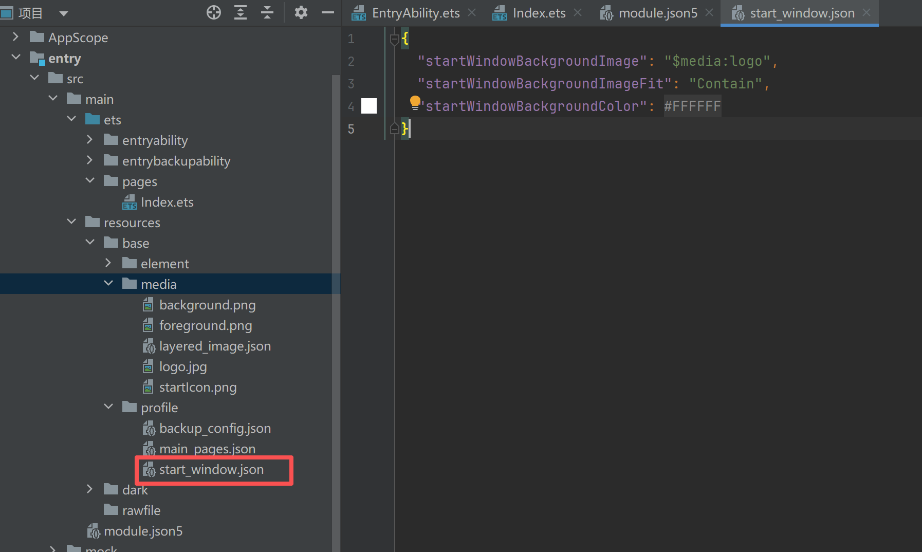 1、这里用新建的demo为例,找到项目中module.json5文件(路径:entry/src/main/module.json5),给UIAbility组件设置startWindow属性。需要注意如果配置了该标签后,startWindowIcon和startWindowBackground标签将不生效。