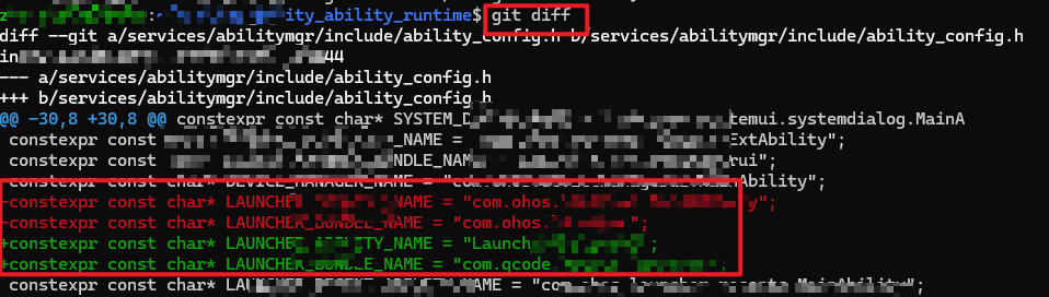 再次执行 git status、git diff 查看是否将.patch文件里面的修改点,合入到ability_config.h文件中。