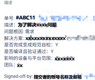 git commit -s 添加描述(必须),格式如下: