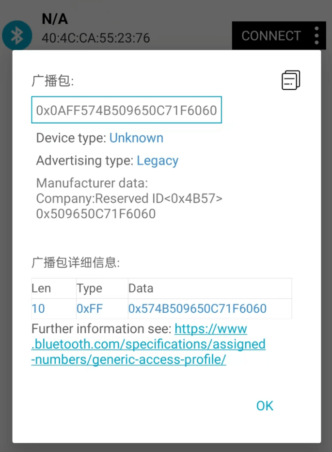 // 广播报文的manufacture部分数据为: 0x0a ff 57 4b 50 96 50 c7 1f 60 60