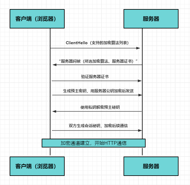 (4)密钥交换:客户端生成预主密钥,用服务器公钥加密后发送。