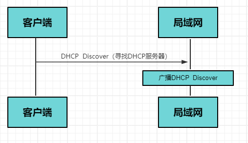 客户端广播 DHCP Discover 包,寻找可用的 DHCP 服务器。