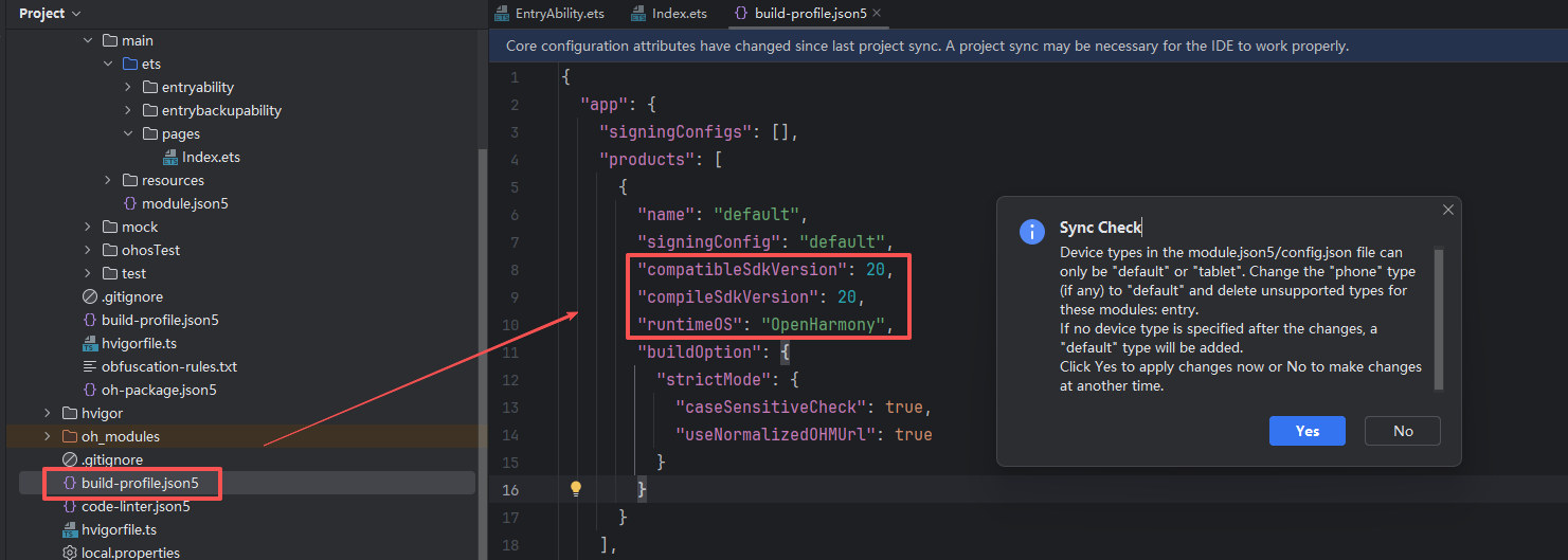 2. 按照示例修改工程级别build-profile.json5文件,Sync后,同意默认设备类型变更。