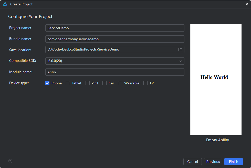 1. 创建新工程ServiceDemo(com.openharmony.servicedemo)