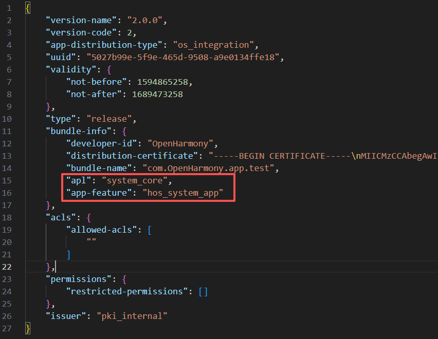 3. 按照示例修改默认签名文件 {SDK目录}/toolchains/lib/UnsgnedReleasedProfileTemplate.json,使得应用可以获得系统API使用权限。