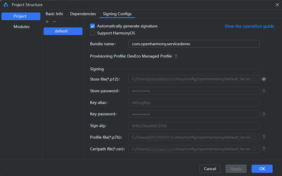 4. 配置自动签名。单击File > Project Structure > Project > SigningConfigs 界面勾选Automatically generate signature ,等待自动签名完成即可,单击OK。
