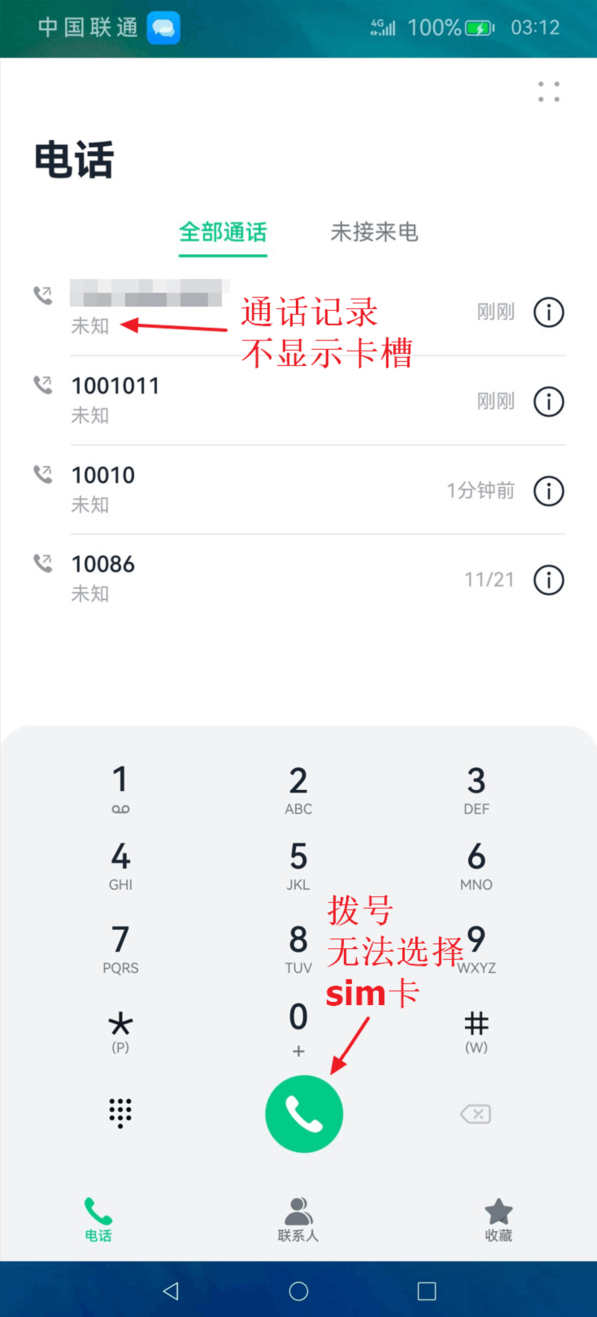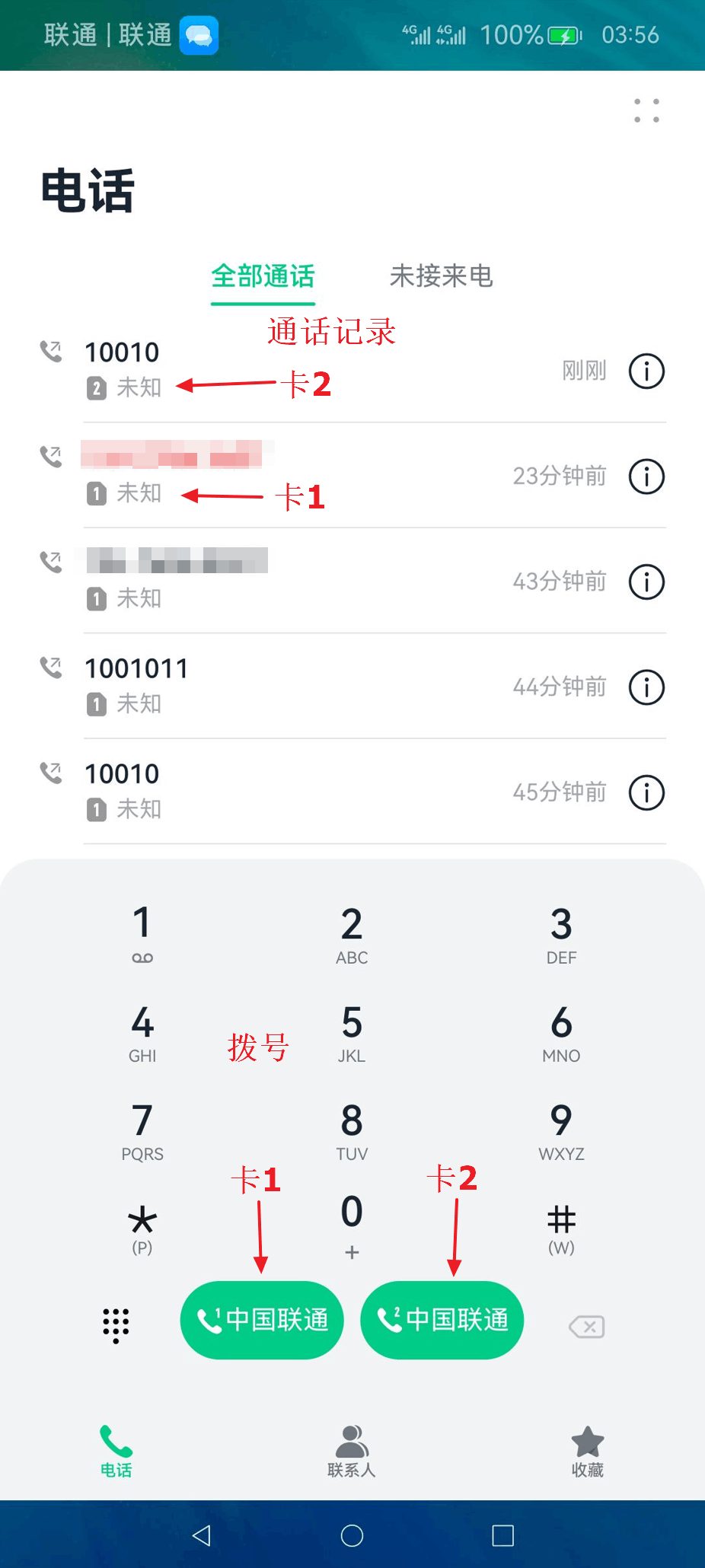 通话记录:通话记录界面中详细显示通话使用的SIM卡