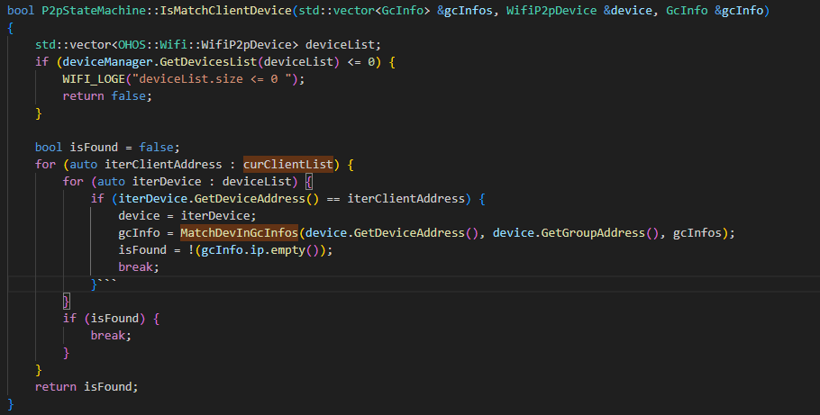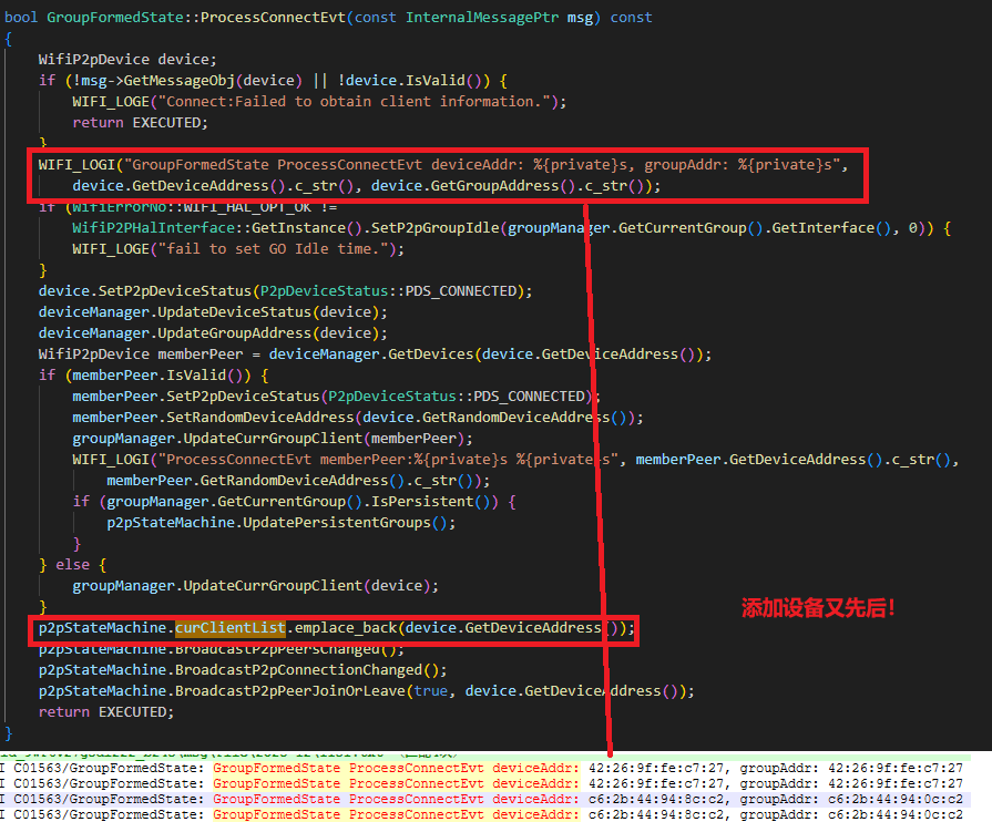 WIFI_LOGE("current connected device not found the Gc"); // 日志中没有这句打印!