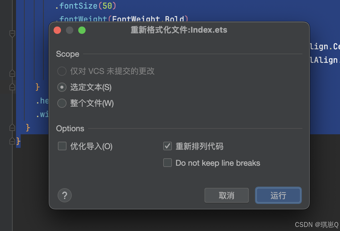 方法二:快捷键:全选代码(ctrl + A)- 勾选重新排列代码(ctrl + alt + shift + L)- 运行