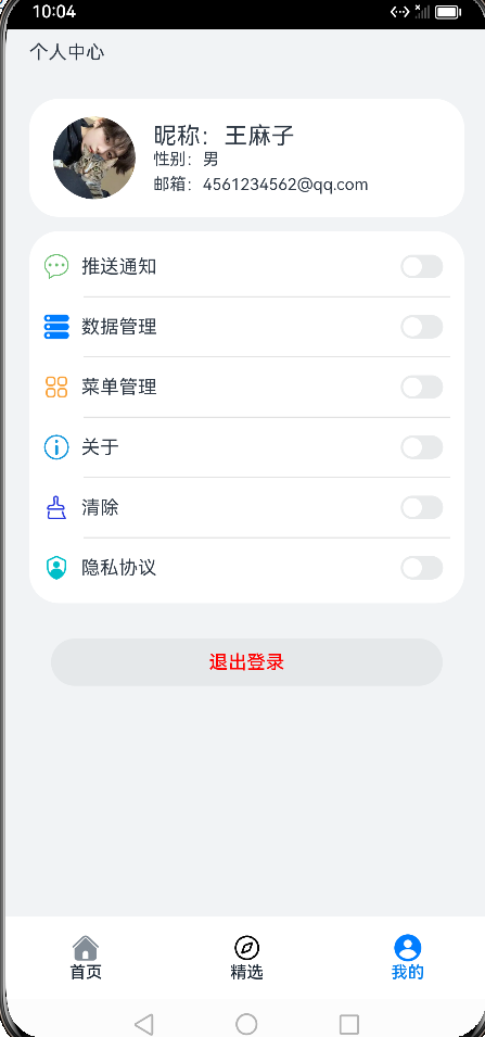 还有最后一个页面的展示,点击退出登录会回到登录页面: