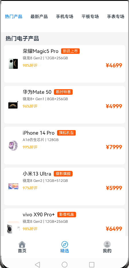 (3)精选页面顶部的导航栏每一页都可以查看,效果如下(手机专场后的图片信息我没有修改,想要了解的小伙伴可自己修改一下):