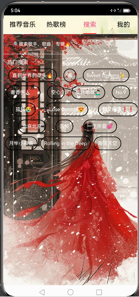 2.进入首页(推荐音乐+热歌榜+搜索+我的)