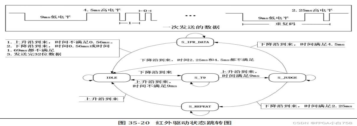 收到38Khz的PWM 时,输出低电平,否则输出高电平。红外遥控器采用了NEC编码规则,当捕获到一个 9ms 低电平 + 4.5ms 高电平时,即收到一个引导码。