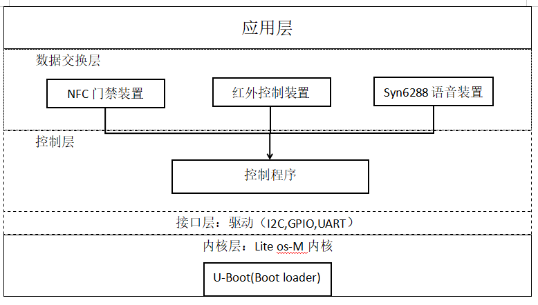 在该项目中,我们将软件整体设计分成应用层,数据交换层,控制层,接口层,内核层,数据交换层采用nfc门禁装置来实现对老师信息的录入和读取以及学生考勤,红外遥控装置实现控制教室功能从而使教学效率提高,采用syn6288语音装置实现对老师刷卡是否可以通过进行判断以及学生考勤,接口层使用驱动(I2C,GPIO,UART),内核层为:Lite os -M内核,从而完成软件整体设计。