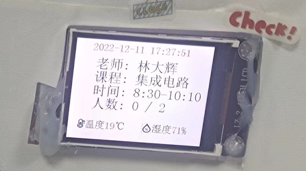 室外配有语音播报模块,NFC门禁模块以及一块2.4寸TFT彩屏,在屏上可显示教室的实时上课信息。