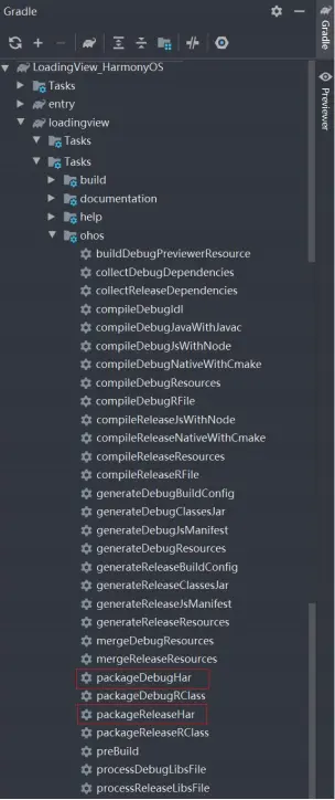 在 Gradle 构建任务中,双击 PackageDebugHar 或PackageReleaseHar 任务,构建 Debug 类型 或 Release 类型的 HAR。