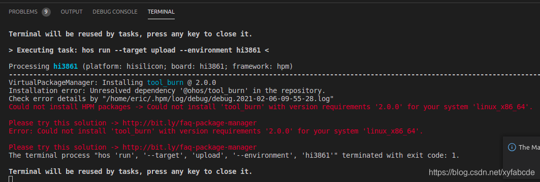 烧录环境按照教程下载了devicetool-linux-tool-2.0.0.0.zip 准备配合VS code 使用。一切就绪,最后一步Upload时爆出了一个错误,意思时tool_burn 这个包用npm安装不上。折腾了一会,放弃了。直接用DevEcoDeviceTool-1.0.0.zip 低版本的Hiburn 烧写成功