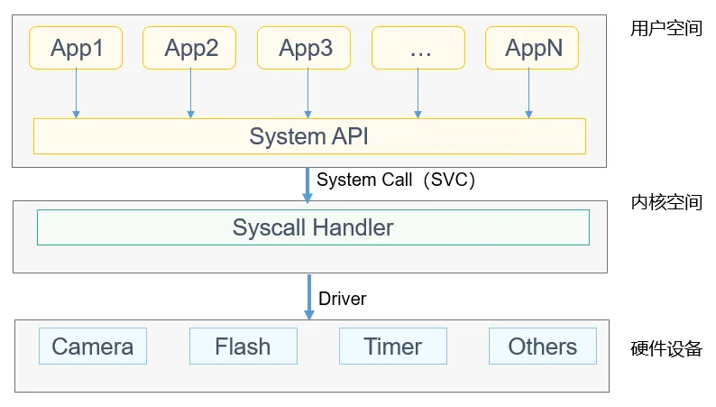如图1所示,用户程序通过调用System API(系统API,通常是系统提供的POSIX接口)进行内核资源访问与交互请求,POSIX接口内部会触发SVC/SWI异常,完成系统从用户态到内核态的切换,然后对接到内核的Syscall Handler(系统调用统一处理接口)进行参数解析,最终分发至具体的内核处理函数。