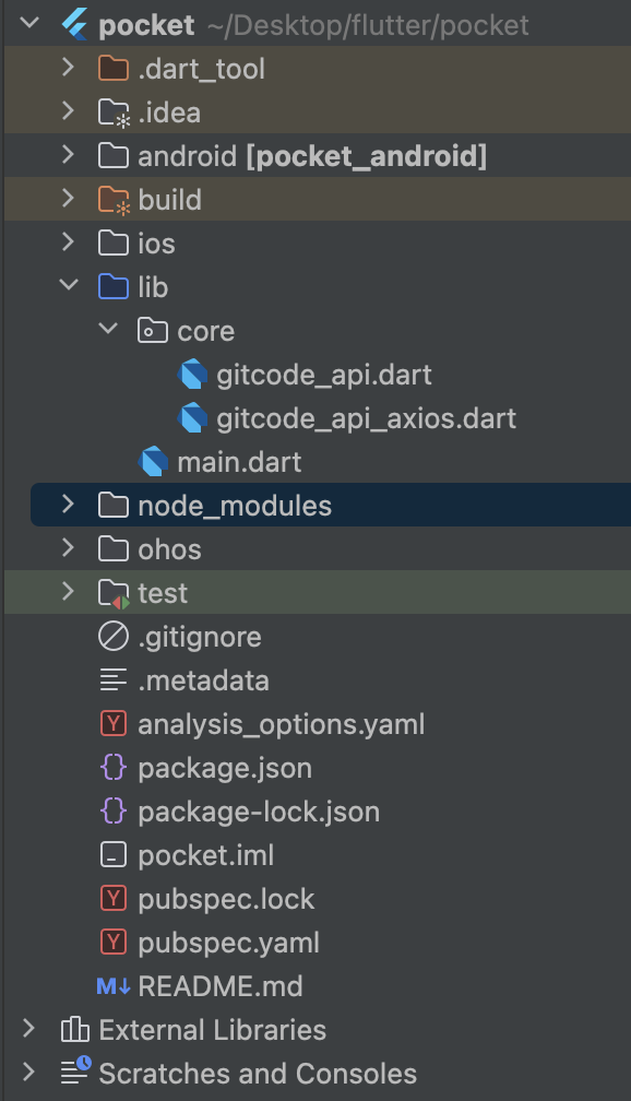 pocket:项目名称,整体是一个 Flutter 工程。.dart_tool:Dart 工具链生成的缓存和配置文件夹,用于 Dart 相关的编译、分析等后台操作。.idea:IDEA 系列 IDE(如 Android Studio)生成的项目配置文件夹,包含 IDE 的设置、运行配置等。android [pocket_android]:Android 平台的工程模块,用于针对 Android 设备的开发、编译和打包,里面包含 Android 项目的源代码、资源和配置文件。build:构建过程中生成的临时文件和编译产物的文件夹,比如编译后的 Dart 代码、资源文件的处理结果等。ios:iOS 平台的工程模块,用于针对 iOS 设备的开发、编译和打包,包含 iOS 项目的相关配置和代码结构。lib:Flutter 项目的核心源代码文件夹,开发者主要的 Dart 代码都写在这里:core:核心功能模块文件夹,通常存放全局配置、工具类、API 封装等基础代码。gitcode_api.dart:针对 GitCode 平台的 API 封装文件,用于处理与 GitCode 相关的网络请求。gitcode_api_axios.dart:可能是基于类似 “axios”(前端常用网络库)的风格封装的 GitCode API 工具类,用于统一管理网络请求逻辑。main.dart:Flutter 应用的入口文件,整个应用从这里启动,会定义根 Widget。
