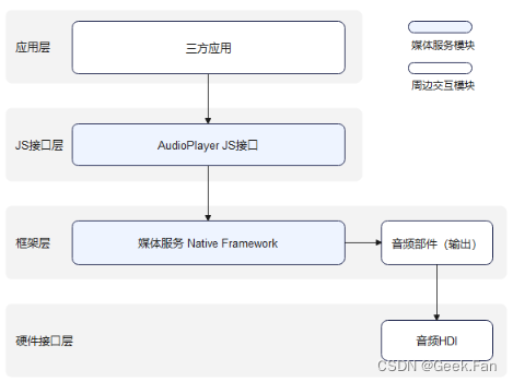 说明:三方应用通过调用JS接口层提供的js接口实现相应功能时,框架层会通过Native Framework的媒体服务,调用音频部件,将软件解码后的音频数据输出至硬件接口层的音频HDI,实现音频播放功能。