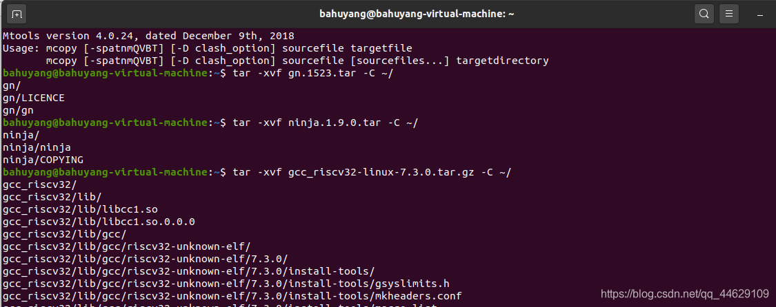 `tar -xvf gcc_riscv32-linux-7.3.0.tar.gz -C ~`/