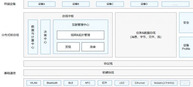 分布式软总线是多种终端设备的统一基座,为设备之间的互联互通提供了统一的分布式通信能力,能够快速发现并连接设备,高效地分发任务和传输数据。分布式软总线示意图见。