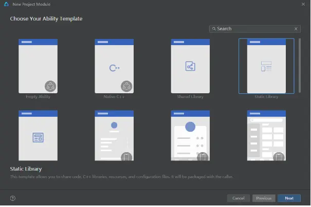 在现有应用工程中,新创建 Module,选择"Static Library"模板,创建完成后,完善 oh-package.json5 的信息,其中包名称、版本等包信息根据实际情况填写。
