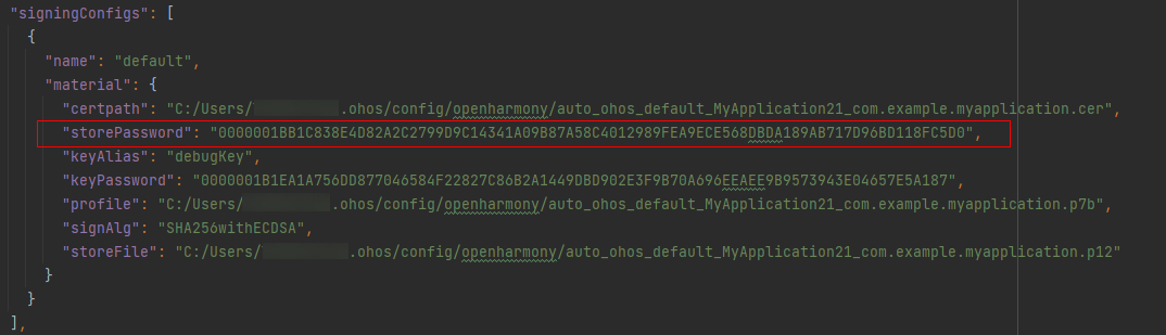 密钥库密码和密钥密码是在创建p12文件时由开发者自行输入的,请牢记该密码。DevEco Studio工程的build-profile.json5文件中有记录密码的密文,但签名工具需要输入密码明文,不能直接将build-profile.json5中的值用到签名工具中。