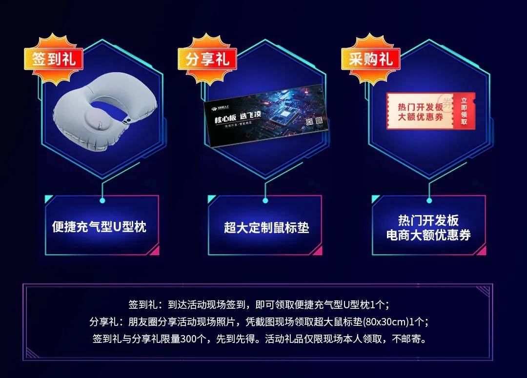 飞凌嵌入式准备了多重好礼——舒适的U型枕、超大的鼠标垫、大额的优惠券,到场即可零门槛获得;参与抽奖,还有机会拥有华为MatePad、华为GT4手表和小米蓝牙耳机。