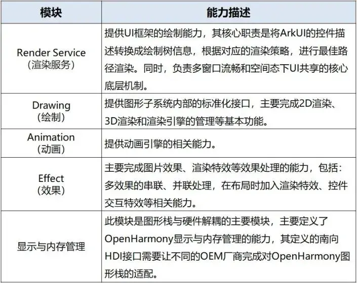 • 框架层: 分为 Render Service、Drawing、Animation、Effect、显示与内存管理五个模块。