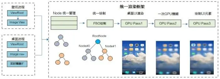 随着应用蓬勃发展,多任务、多窗口越来越普遍,给动效呈现带来了很大挑战。比如下面的视频,长按应用图标,桌面和壁纸产生模糊效果。由于桌面和壁纸是独立绘制、分离渲染的,要想实现动态实时模糊,需要在合成阶段进行模糊处理(GPU 合成方式),导致性能和功耗的代价高,用静态模糊的效果是一种比较“经济”的做法。