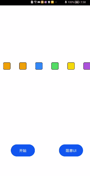 如果 UI 主线程的业务阻塞,这很容易引发动画卡顿的现象,给用户带来不好的体验。下面的 Demo 模拟了 UI 主线程业务阻塞的场景,可以看到动画明显卡顿了。