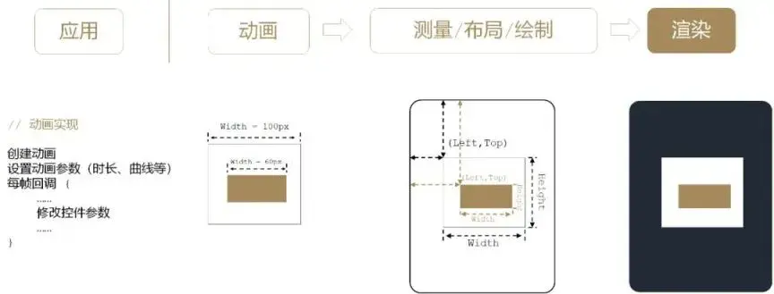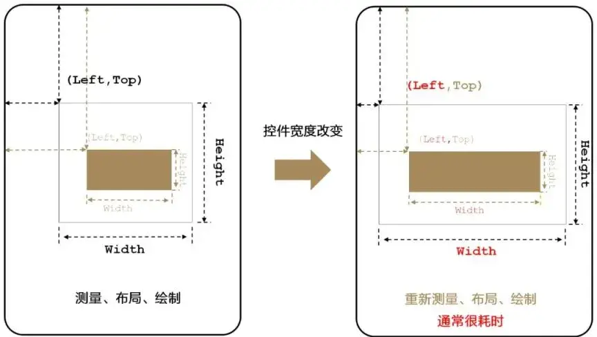 在测量/布局/绘制阶段,如果控件属性发生变化(如图 3),则每一帧都要重新测量、布局和绘制。这意味着每一帧都会引入图形计算负载,增加了耗时,且最终影响动画效果。