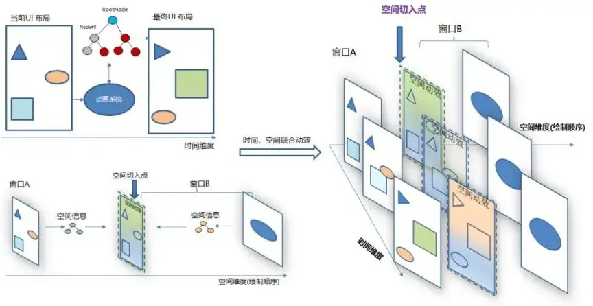 此外,OpenHarmony 图形栈从时间和空间上提供了更丰富的动效能力。空间维度上,更容易实现空间相关的动效。时间维度上,开发者只需设置终止界面,图形栈自动进行插值计算,简化复杂的计算。