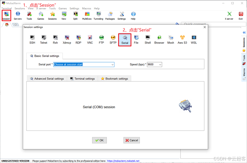 打开MobaXterm软件,点击 Session,再点击 Serial。如下图所示: