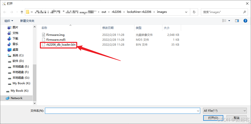 弹出打开对话框,选择主目录下 out/rk2206/lockzhiner-rk2206/images,选中 rk2206_db_loader.bin文件。如下图所示: