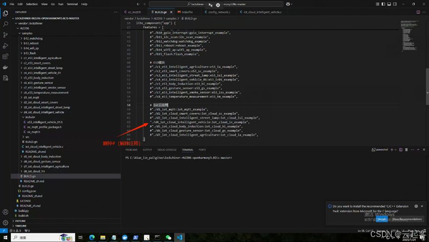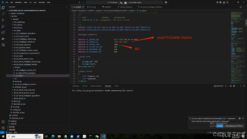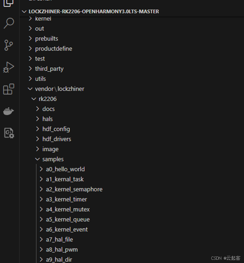 如下图,gitee\lockzhiner-rk2206-openharmony3.0lts-master\vendor\lockzhiner\rk2206\samples,(官方gitee代码)此文件夹下对 应着所有示例代码,以下我们将以d4_iot_cloud_intelligent_vehicle(智慧车载)为案例进行讲解。