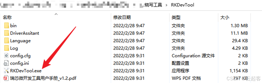 打开烧写工具RKDevTool,点击RKDevTool.exe。如下图所示: