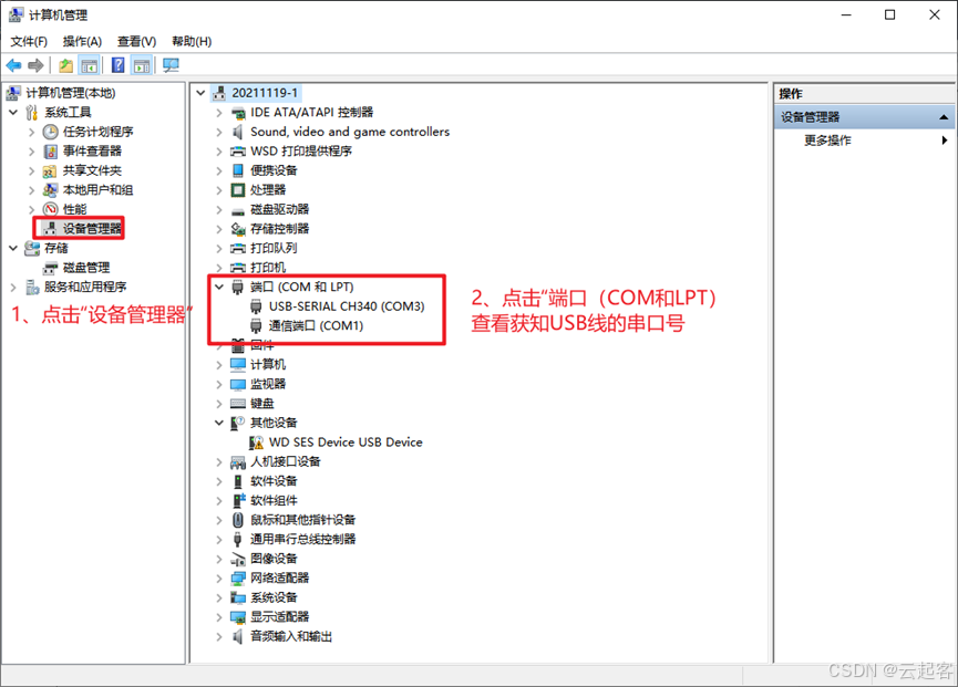 在计算机管理对话框中,点击 设备管理器,点击 端口(COM和LPT),查看获知COM3是USB串口线。