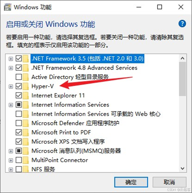 勾选“Hyper-V”选项,具体如下所示: